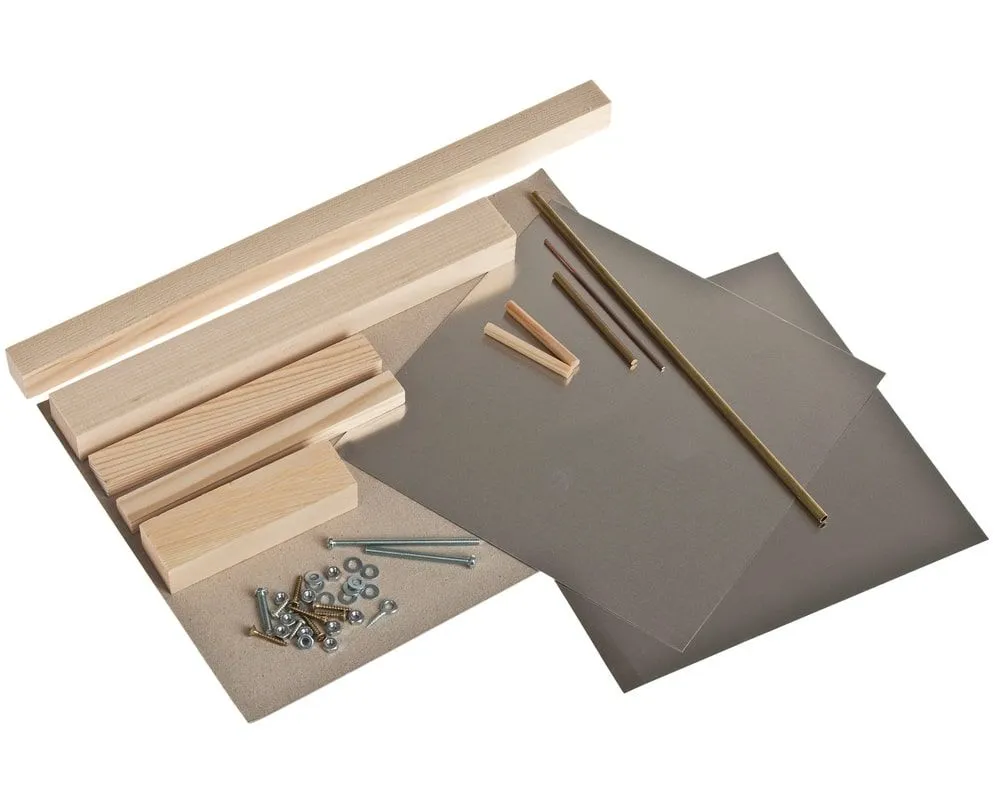 • Benötigte Werkzeuge: Bohrer, Säge, Hammer, Seitenschneider/Zange, Schraubenschlüssel, Schere, Klebstoff, Lineal/Winkel, Bleistift, Feile/Schleifpapier