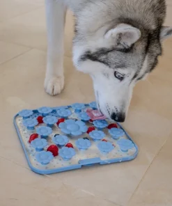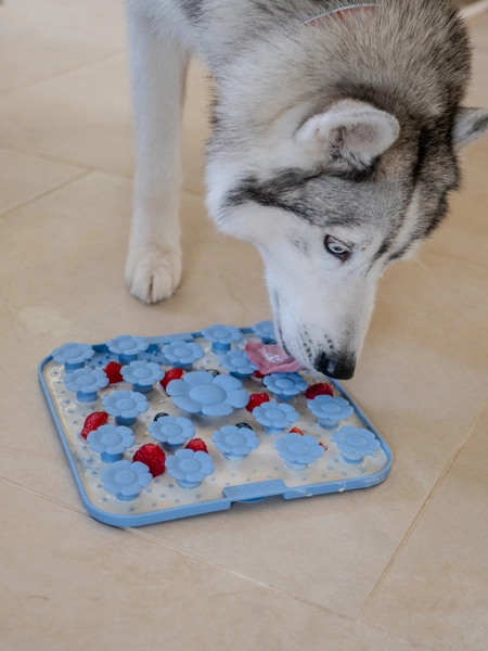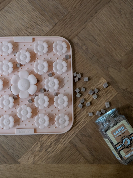 - Einfach Nassfutter, Joghurt, Erdnussbutter, Bananen, Hundesmoothie, Hüttenkäse, Leberwurst und Leckerlis etc. auf der Oberfläche verteilen und schon geht es für einige Minuten intensiver Beschäftigung los