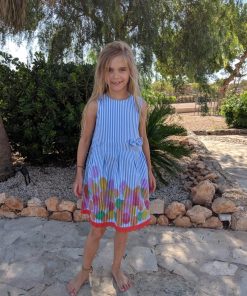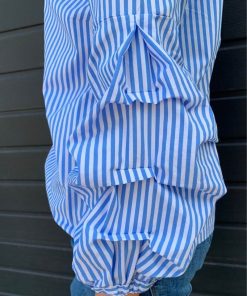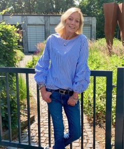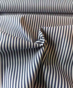 Hochwertiger, elastischer Baumwollstoff in Blau / Weiß gestreift. Ideal für leichte Blusen, Hemden, Hemdkleider, Kleider, Hosen, Lätzchen, Röcke und vieles mehr. Abbildung Schnittmuster Damenbluse Augusta und Kleid Nona in hellerer Farbstellung aber gleicher Artikel. Bei dem Kleid Hille haben wir einen “Kartoffeldruck” mit Textilfarbe aufgebracht.