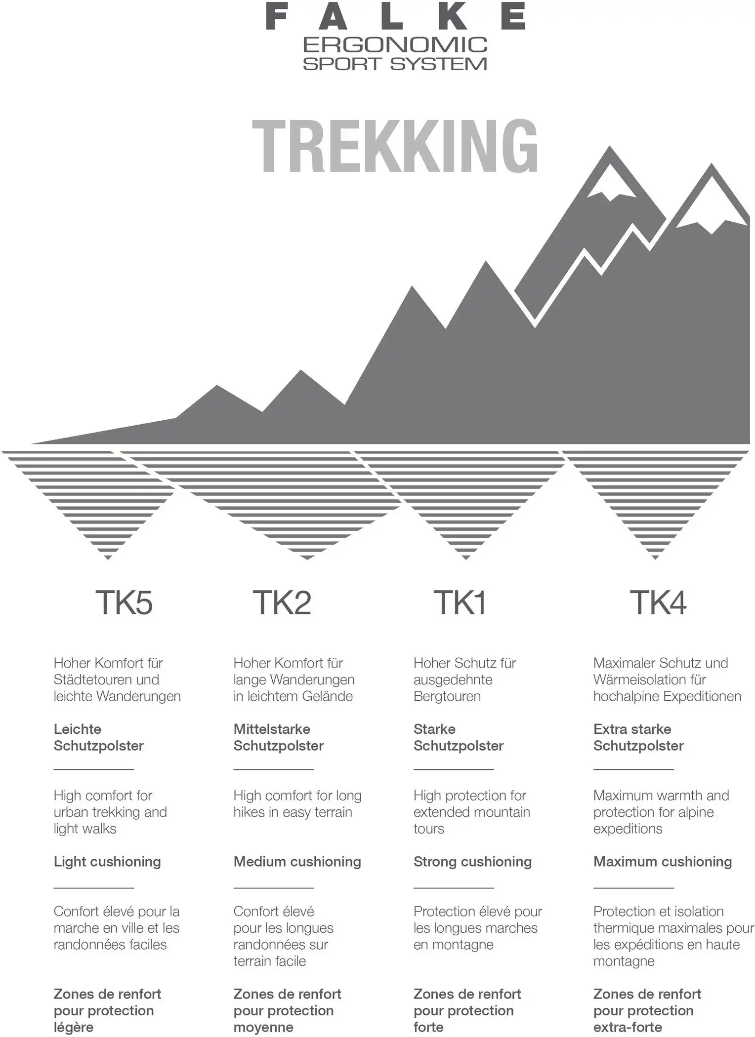 Mit ihrer extra starken Polsterung und ihrem Merinowoll-Mix sorgt die Wandersocke „TK1“ für maximalen Schutz und gute Wärmeisolation bei ausgiebigen Bergtouren unter jeglichen Wetterbedingungen. Schneller Feuchtigkeitstransport sowie die optimale Passform garantieren perfekte Temperatur und hohen Komfort am Fuß.