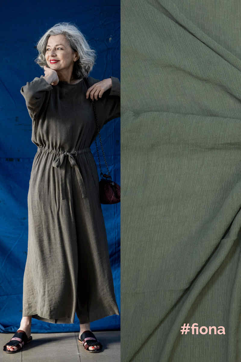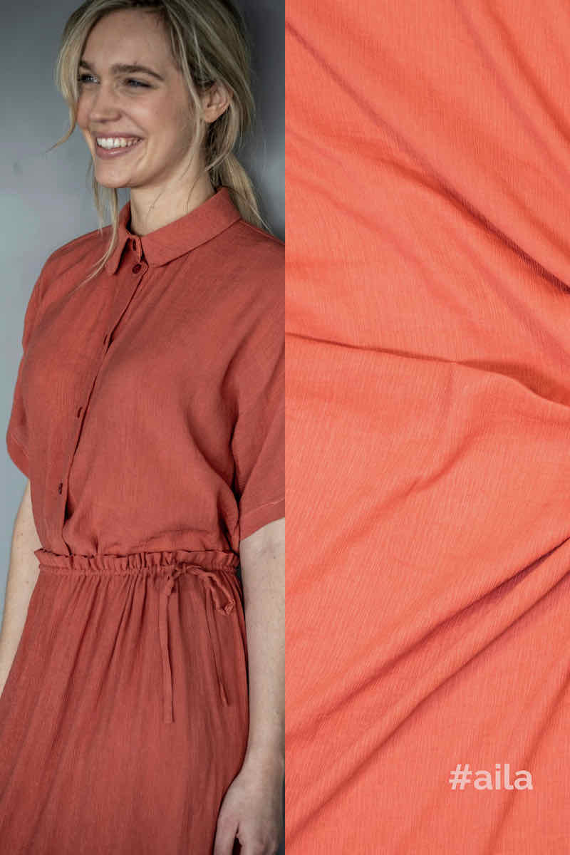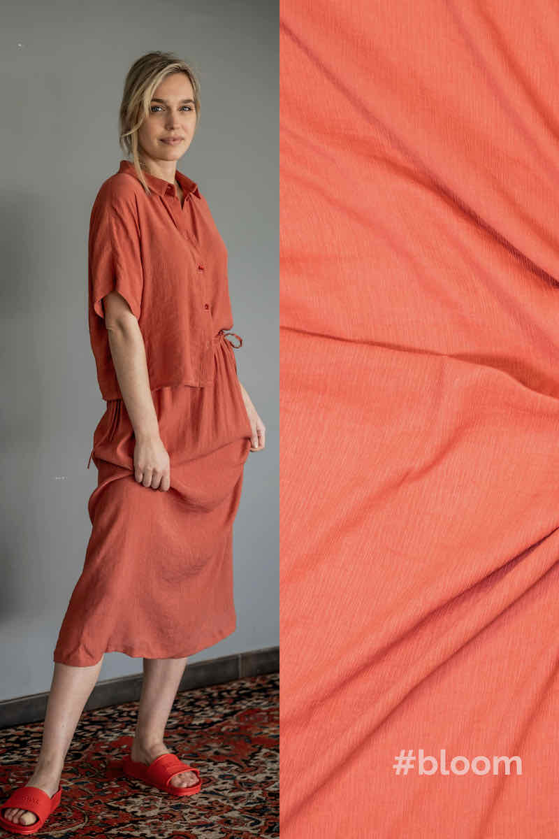 Dieser wunderschöne Viskose Stoff überzeugt durch seinen minimalen Falten die aussehen wie eine Struktur im Stoff. Vernäht wird dieser Stoff wie ein normaler Viskose Stoff. Hier kannst Du wunderbar Röcke, Kleider oder auch Blusen nähen. Abbildung Schnittmuster Bloom und Fiona aus der Fibre Mood Fiona, Danna, Bloom und Aila in diversen Farbstellungen.