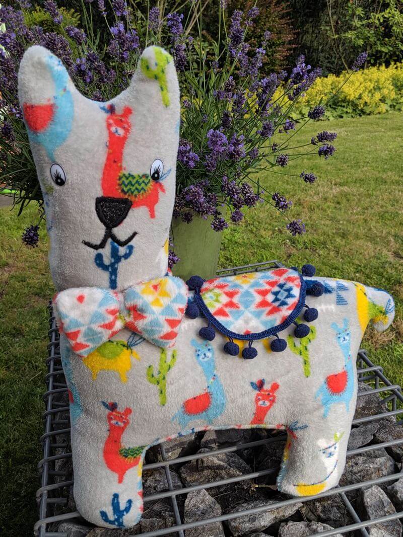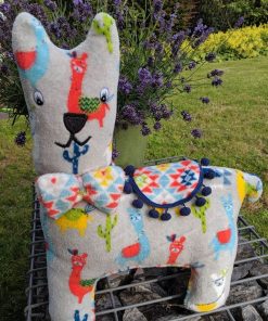 Ein wunderschönes weiches und kuscheliges Fleecematerial, wird oft auch als Flausch bezeichnet. Die eine Seite ist mit bunten Lamas auf Grau, die andere Seite mit einer bunten Musterung auf Weiß. Es ist ideal für Loopschals, Mäntel, Jacken, Röcke, Mützen und vieles mehr. Das Material ist dehnbar. Abbildung Schnittmuster Jacke Jannicke. Der Stoff kann auch ganz einfach am Rand eingesäumt werden und ist damit eine einfach gemachte Babydecke.