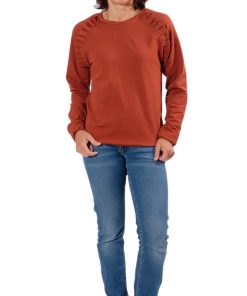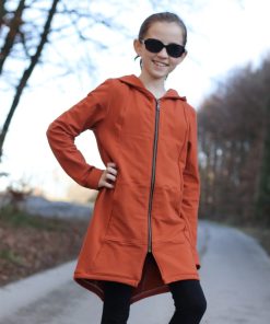 Ein hochwertiger French Terry Stoff aus Baumwolle/Elasthan in einem dunklen Rost Ton, Terra genannt. Kleider, Shirts, Hosen, Mützen und vieles mehr lassen sich hier wunderbar daraus nähen. Die Innenseite ist angeraut und kuschelig weich! Abbildung Schnittmuster Jacke Almuth in Rost. Der Farbton Terra ist noch eine Nuance dunkler!