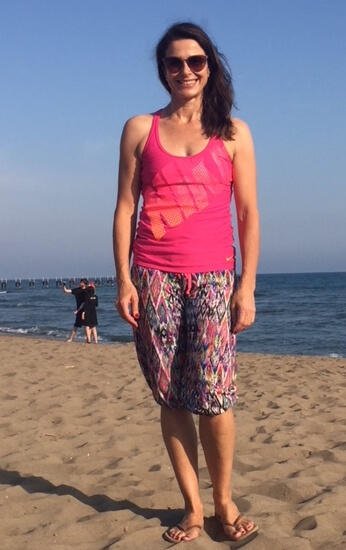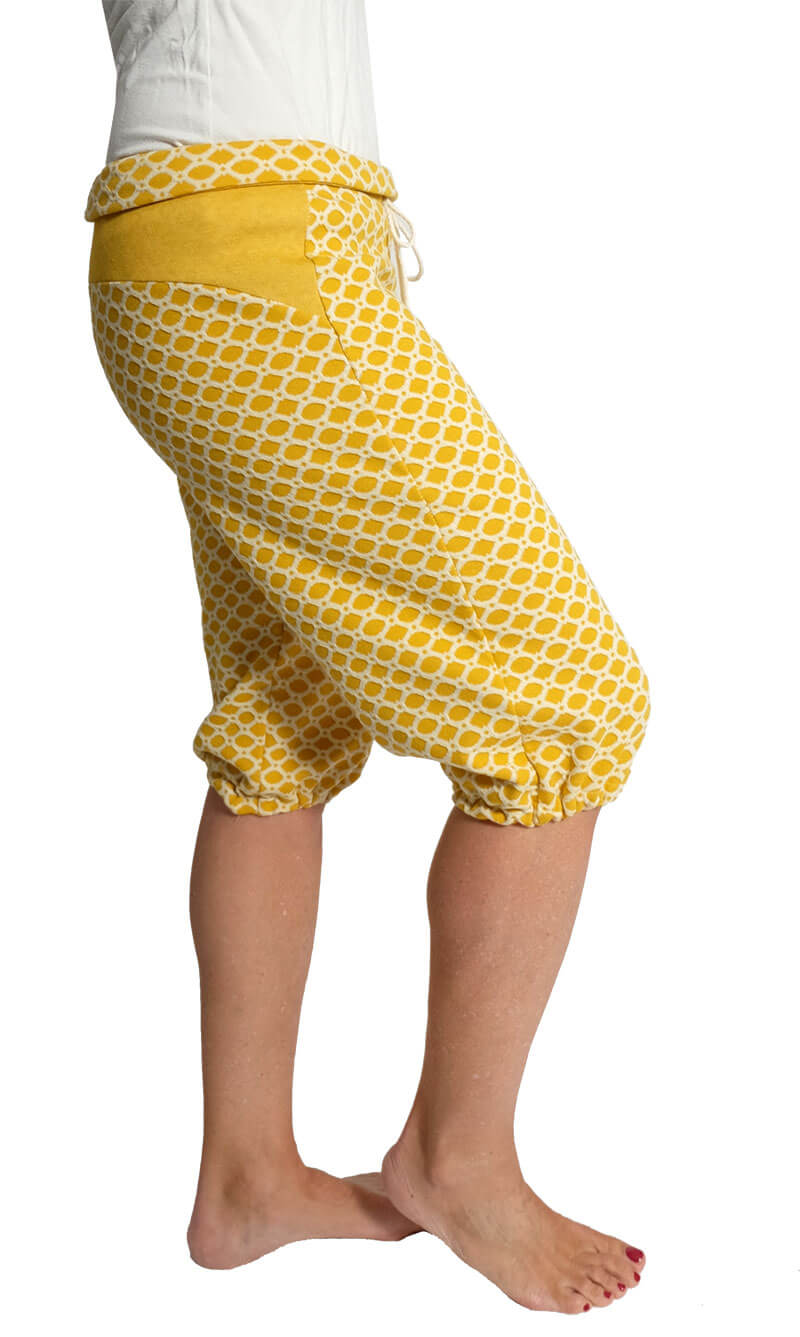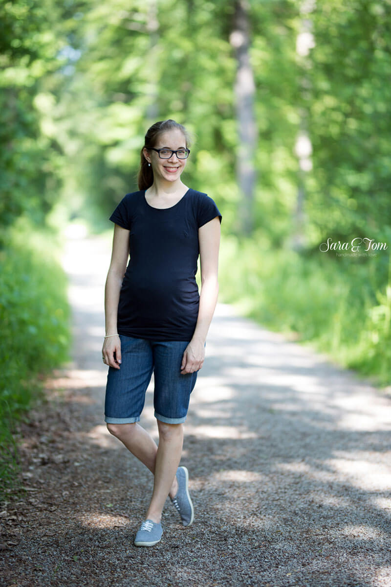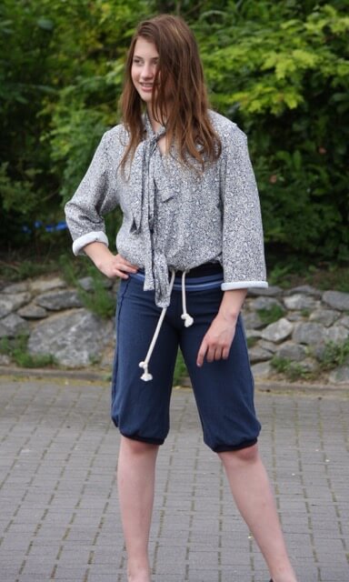 Diese unkomplizierte Hose mit verlegter Seitennaht ist ein tolles Projekt für Anfänger. Hier kann wenig schief gehen und es gibt tolle Gestaltungsmöglichkeiten. Ob durch die Verwendung von linker und rechter Stoffseite oder durch Ösen, Nieten etc. Bei diesem Style kannst Du sehr kreativ werden! Diese Hose kann auch sehr gut von Schwangeren getragen werden, siehe Bebilderung!