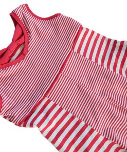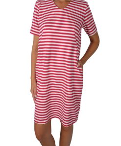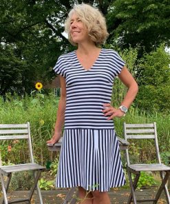 Ein hochwertiger Jersey mit taupe-weißen Streifen, die je 1,2 cm breit sind, bedruckt. Es gibt hier noch weitere Stoffe aus dieser Serie, die man wunderschön miteinander kombinieren kann. Das Material ist ideal für Shirts, Kleider Hosen, Pumphosen und Oberteile. Abbildung Schnittmuster Kinderkleid Ruby und Sweatshirtkleid Ina in Rot. Schnittmuster Damenkleid Lenka und Shirt Doro in Marine. Shirt Fiete in Taupe / weiß in Kombination mit uni Stoffen und Shirt Erik.