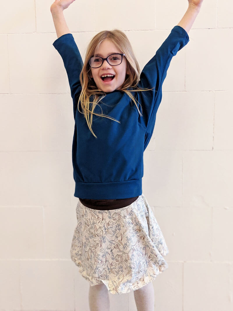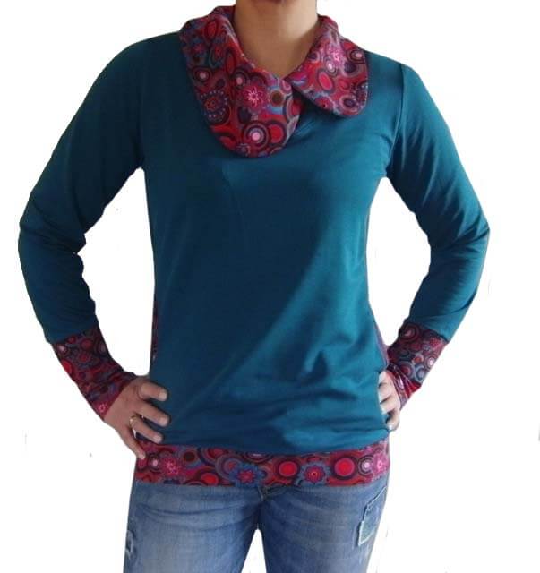 Ein hochwertiger Single-Jersey aus Baumwolle/Elasthan in einem blaustichigen Petrol. Abbildung Schnittmuster Pullover Karin und Fledermausshirt Kitty.