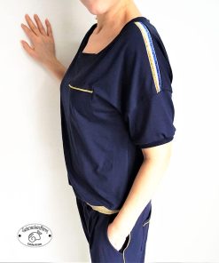 Dieser Jumpsuit hat einen coolen Look und ist für viele Figuren sehr gut geeignet. Wichtig ist, dass die Stoffe weich und fließend fallen. Je nach Stoff und Verarbeitungsvariante bekommst Du gleich einen anderen Look. Für die kühleren Jahreszeiten kannst Du ganz einfach ein T-Shirt darunter kombinieren oder eine Jacke drüber ziehen! Die Bloggerin Sara von “Sara & Tom” hat sich den geblümten Jumpsuit für die Schwangerschaft genäht. Dazu hat sie das Vorderteil um 8 cm verlängert und dieses dann im Bauchbereich mittels Framilon wieder auf die Länge des Rückenteils gerafft. Ein super Idee, um aus dem Jumpsuit einen tollen Begleiter für die Schangerschaft zu machen. Sehr schön sieht hier unsere Cadigan Jacke Tatjana dazu aus.