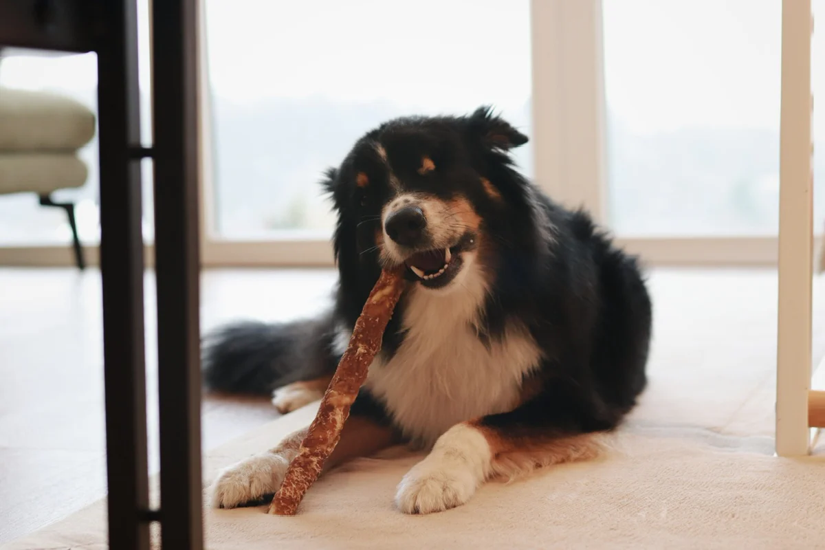 Der getrocknete und fettarme Snack aus Rinderhaut, umwickelt mit Hähnchenfilet ist ca 25-30cm lang und beschert einen längeren Kauspaß. Unsere Australien Shepherd Hündin Bailey ist etwa 30 Minuten mit der leckeren Stange beschäftigt.