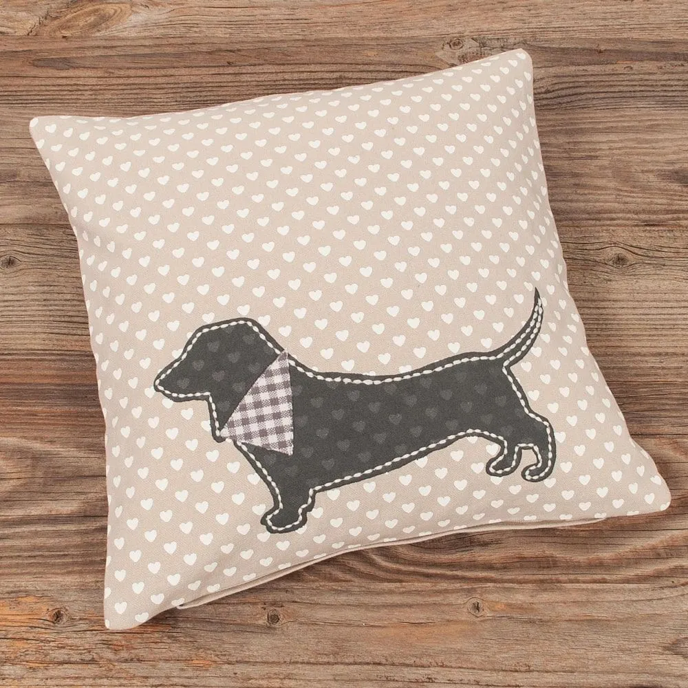 • Kissenhülle / Kissenbezug für Sofakissen aus Stoff beige mit kleinen weißen Herzchen & Dackel Applikation – trendiger Landhaus-Stil – Serie TRAUDL