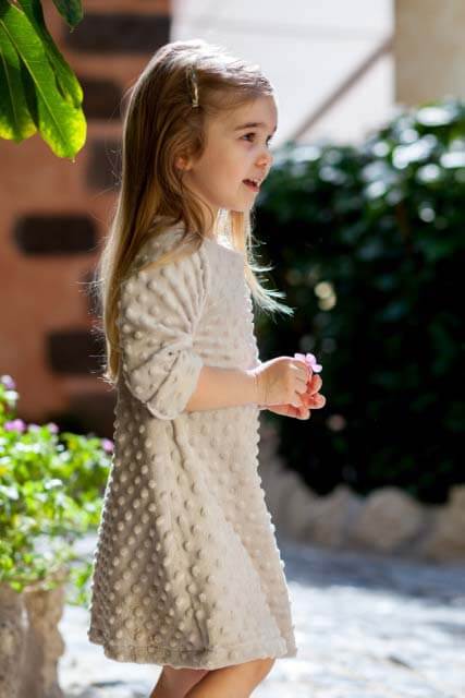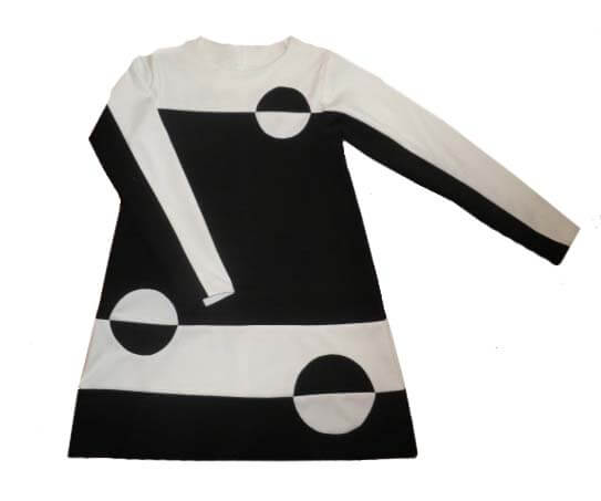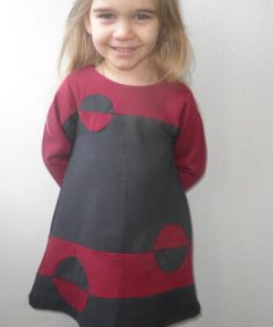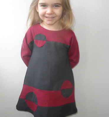 Dieses Kleid sollte aus dickeren, dehnbaren Stoffen wie Romanit oder Punte Roma Qualitäten genäht werden. Ein dünner Jersey ist zu dünn und das Kleid fällt dann auch nicht besonders schön. Das Kleid ist nicht besonders schwer zu nähen, alleine die Kreise sind vielleicht am Anfang etwas kniffelig. Aber hier kannst Du auch vorher mal mit Reststücken testen und probieren. Der Rest ist auch für Anfänger kein Problem. Wer schon mal das ein oder andere Kleid genäht hat, bekommt das hier dann ganz sicher auch hin. Und der Schnitt ist auch ganz flexibel. Du kannst auch alle Teile zusammenlegen und ein unifarbenes Kleid draus nähen, siehe das Beispiel mit dem Noppenfleece.