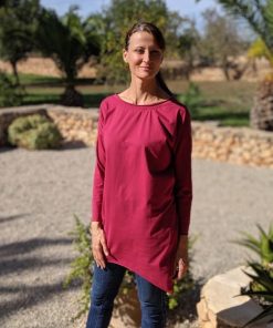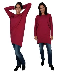 Materialempfehlung: Dehnbare, weiche Jerseystoffe. Zu dick oder zu fest sollte der Stoff nicht sein, es ist nämlich viel Weite enthalten und dann sieht die Silhouette nicht mehr so hübsch aus. Für die lange Version mit offenen Kanten am besten einen unifarbenen, durchgefärbten Jersey.