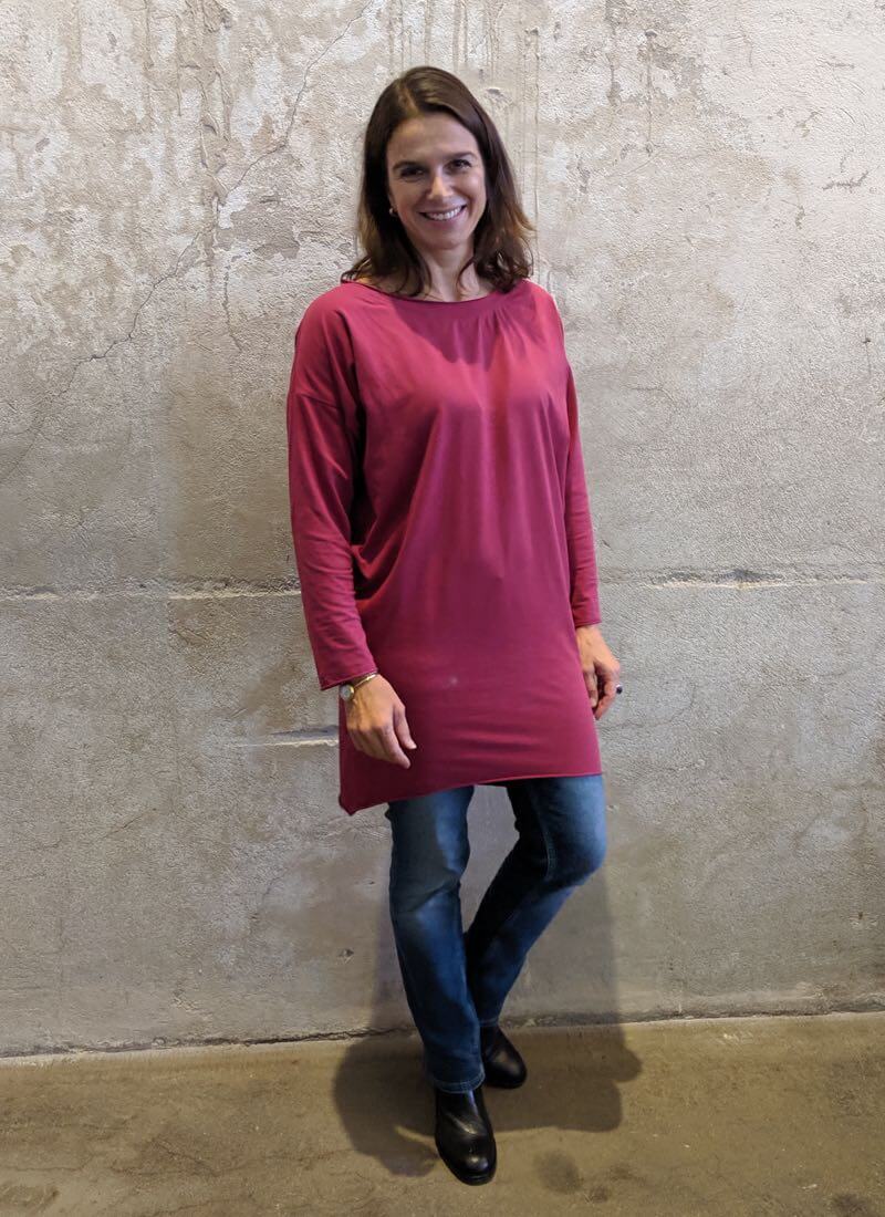 Materialempfehlung: Dehnbare, weiche Jerseystoffe. Zu dick oder zu fest sollte der Stoff nicht sein, es ist nämlich viel Weite enthalten und dann sieht die Silhouette nicht mehr so hübsch aus. Für die lange Version mit offenen Kanten am besten einen unifarbenen, durchgefärbten Jersey.
