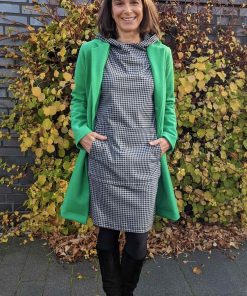 Materialempfehlung: Grundsätzlich kannst Du das Kleid aus allen weich fallenden, dehnbaren Stoffen nähen. Wir empfehlen Romanit-, Jacquard- oder Sweatshirtstoffe. Je mehr Stand der Stoff hat, desto schöner ist die Silhouette. Zu schwer sollte der Stoff aber nicht sein, gerade bei der Variante mit Kapuze. Warum? Weil schwere Stoffe ziehen die Kapuze am Hals immer etwas nach hinten. Wer hier empfindlich ist sollte die Schalkragenvariante wählen.