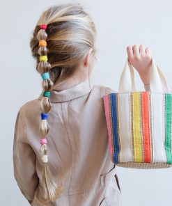 - Gewebte Tasche mit neutralem Futter mit einem Regenbogen aus hellen und kräftigen Bandstreifen und stabilen Tragegriffen