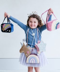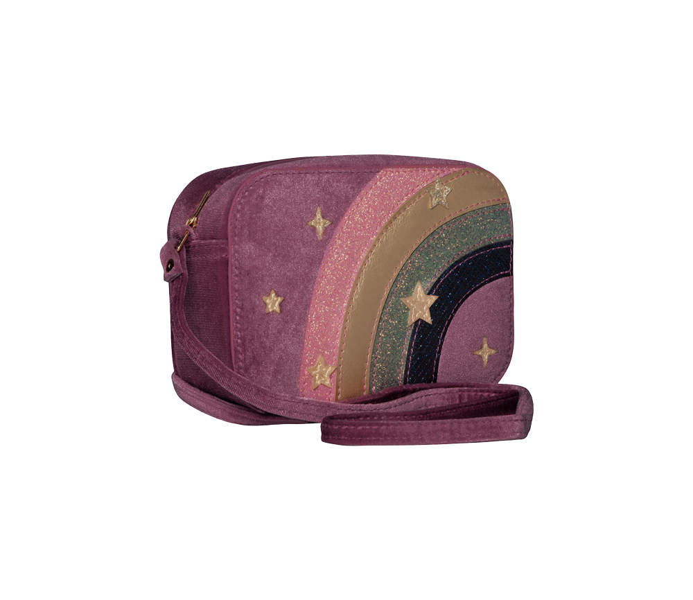 Mimi & Lula Kindertasche OVER THE RAINBOW. Diese niedliche Umhängetasche bietet Platz, um kleine Schätze, Kleingeld oder einen Schlüssel zu verstauen. Der Samtlook mit dem Regenbogen aus matten Metallic- und Glitzerstoffen und den goldenen Sternen ist ein echter Blickfang. Diese süße Tasche mit Reißverschluss ist ideal für den Alltag und perfekt für Partys!