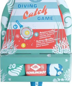 Jetzt wird abgetaucht: Das Diving Game Catch testet eure Reaktionsgeschwindigkeit unter Wasser! Mit dem Kescher müsst ihr versuchen die sinkenden Gewichte im Wasser zu fangen. Aber aufgepasst: Die 5 Tauchgewichte in unterschiedlichen Farben (ca. 100g, 70g, 45g / Ø 7cm) haben 3 verschiedene Punktzahlen. Die Gewichte mit den höheren Punktzahlen sind schwerer und sinken schneller. Geht also taktisch vor und schnappt euch schnell die maximalen Punkte. Material: Polyester, PP, Neopren, Sand. Die über 100 Jahre alte deutsche Marke Schildkröt gilt als Erfinder des Tischtennisballs. Heute bietet Schildkröt neben Tischtennis auch eine sehr umfangreiche Funsport-Kollektion an und gilt als Marktführer in diesem Bereich. ACHTUNG! Nur im flachen Wasser unter Aufsicht von Erwachsenen verwerden.