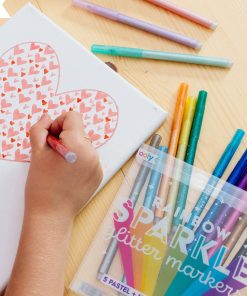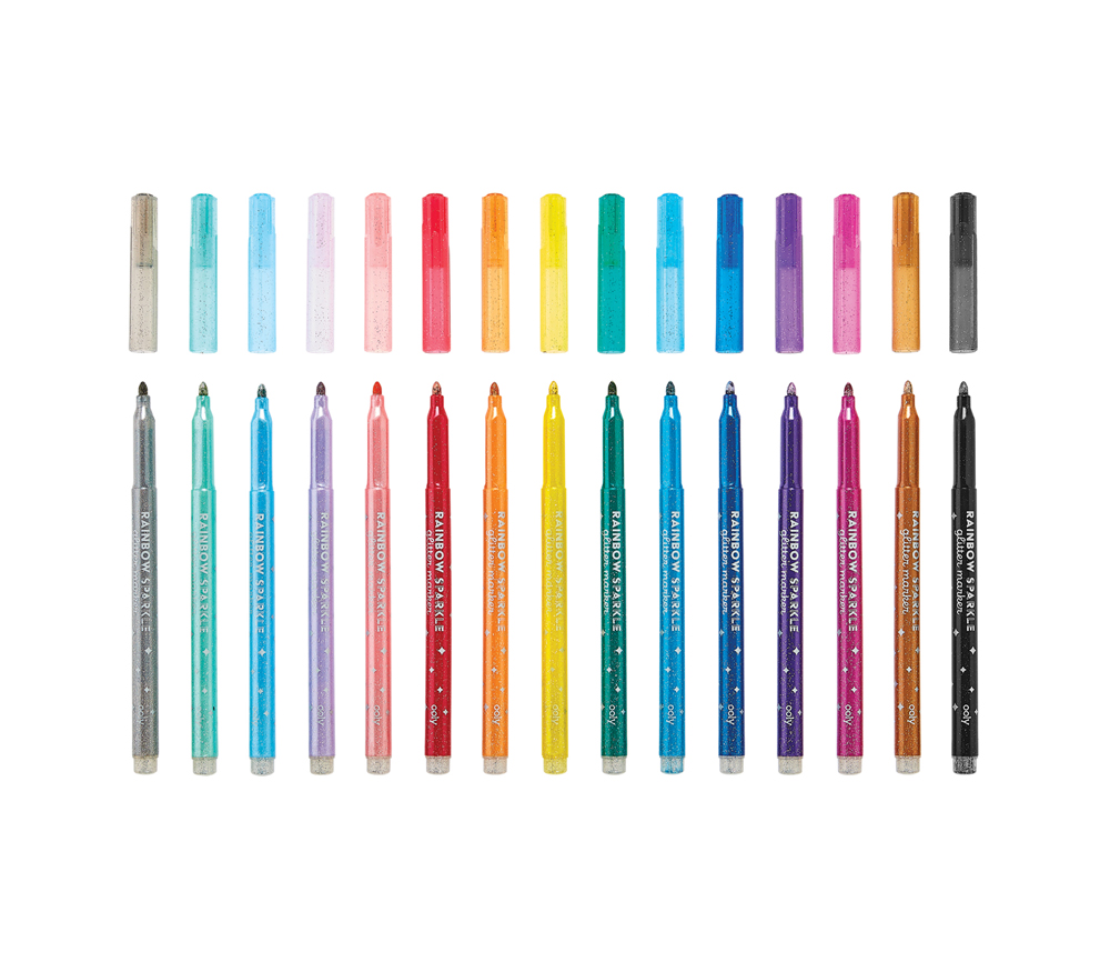 15 Regenbogen Glitzer Marker von OOLY für coole, kreative, kunterbunte kleine Kunstwerke. Das Set besteht aus 10 klassischen Regenbogenfarben und 5 Pastellfarben und alle glitzern schön. Mit diesen Stiften malen Kinder besonders gern. Geeignet sind die Marker für Kids ab 4 Jahre.