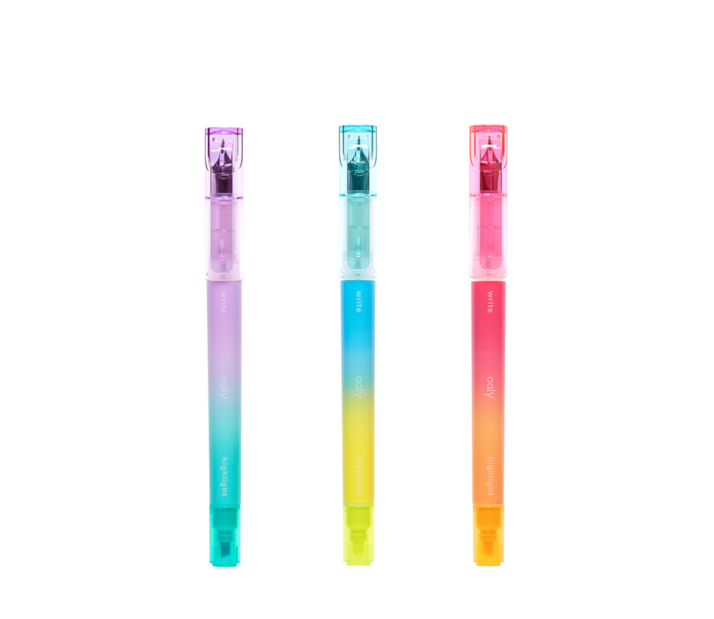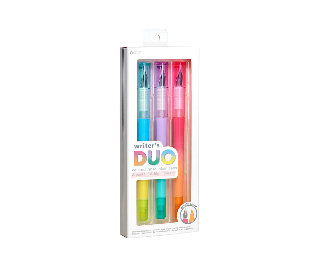 Writer’s Duos ist ein Set aus drei Füllfederhaltern mit farbiger Tinte, die in wunderschönem Blau, Rosa und Lila schreiben. Wenn Sie den Stift umdrehen, erscheinen die Textmarker mit Keilspitze in Pastellfarben wie Gelb, Blaugrün und Orange.