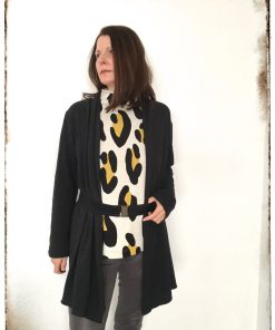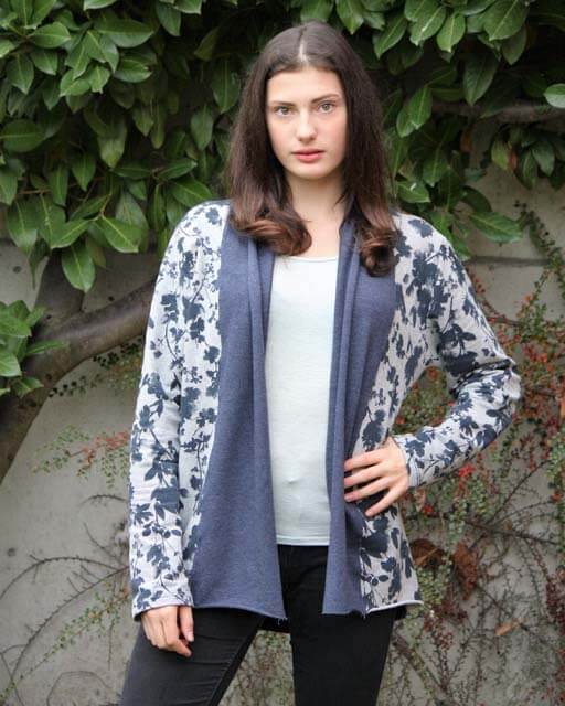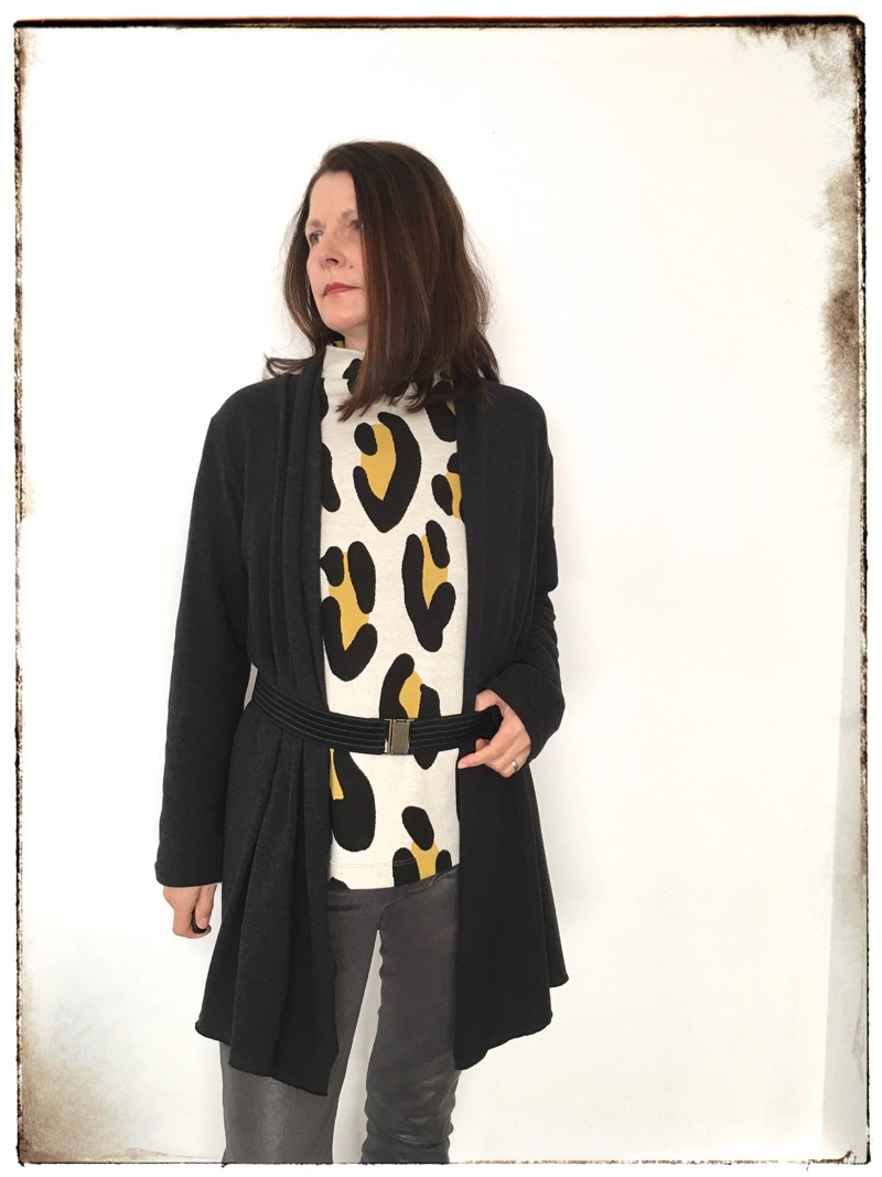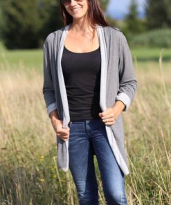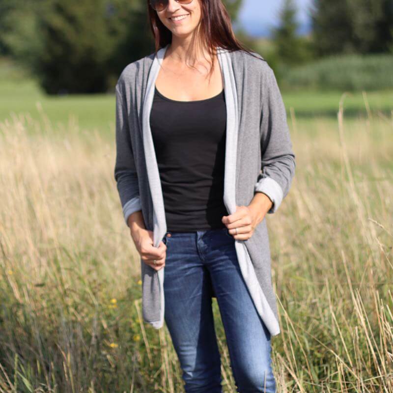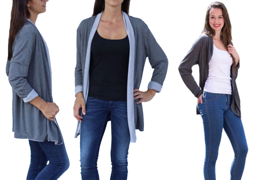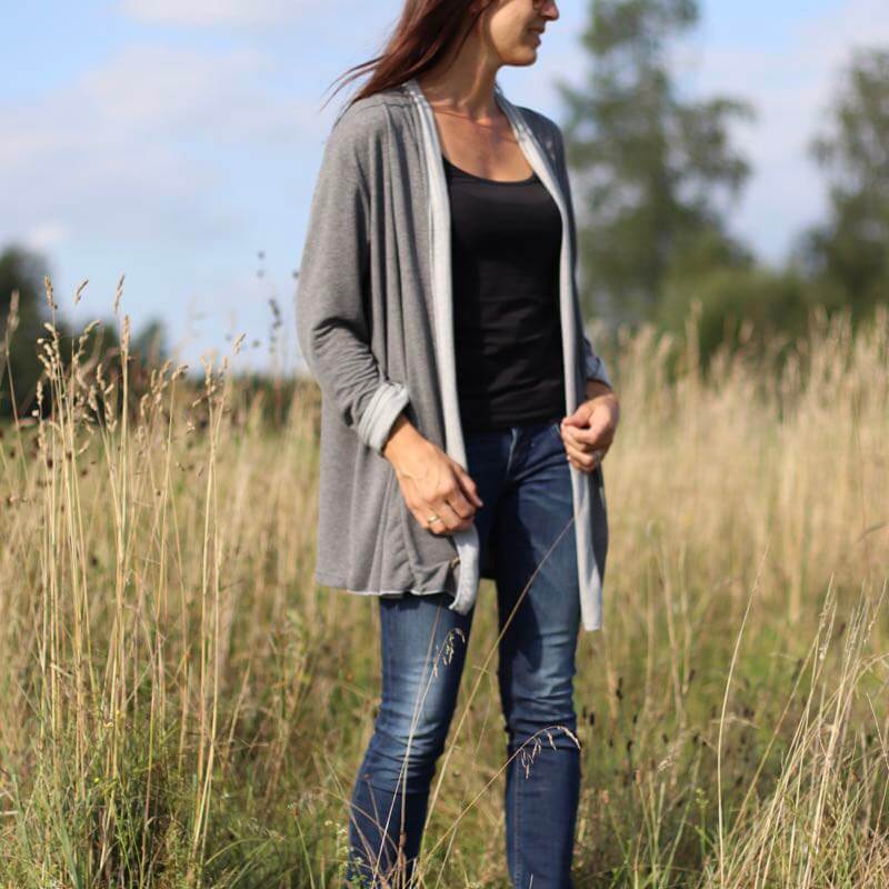 Diese Jacke kannst Du auf verschiedene Arten nähen, ein Schnitt mit vielen Verarbeitungsmöglichkeiten. Im Ebook erklären wir alle Varianten Schritt für Schritt. Ob klassisch oder im “Used Look”, das Modell wirst Du sicher einige Male nähen. Die Jacke ist aber nicht nur optisch ein Highlight, auch das Nähen geht sehr schnell und einfach und ist auch für Nähanfängerinnen gut machbar. Wichtig ist die Stoffauswahl, da die linke Warenseite durch den “Schalkragen” sichtbar wird. Je leichter und schöner die Ware fällt, desto hübscher finden wir die Jacke. Dicke, schwere Stoffe eignen sich hier nicht. Die Jacke kann optional mit seitlichen Eingriffstaschen genäht werden.
