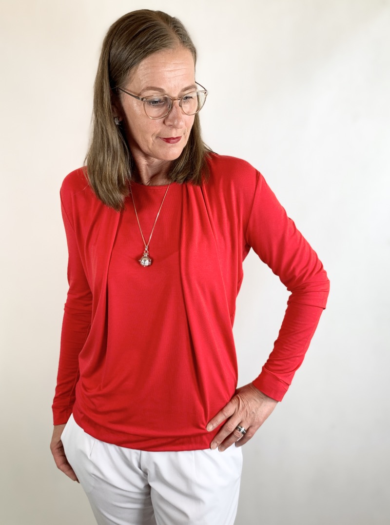 Dieses hübsche Shirt mit dem angeschnittenem Schalkragen und dem außergewöhnlichen Look ist etwas für Fortgeschrittene. Warum? Weil es aus dünnen, fließenden Stoffen genäht werden soll. Viskosejerseys und dünne Strickstoffe eignen sich sehr gut. Je nach Stoff wird es vom Style auch immer wieder anders aussehen. Unser Bambus Jersey eigent sich hier hervorragend, siehe Beispiel in Rot, Rosa und Blau.