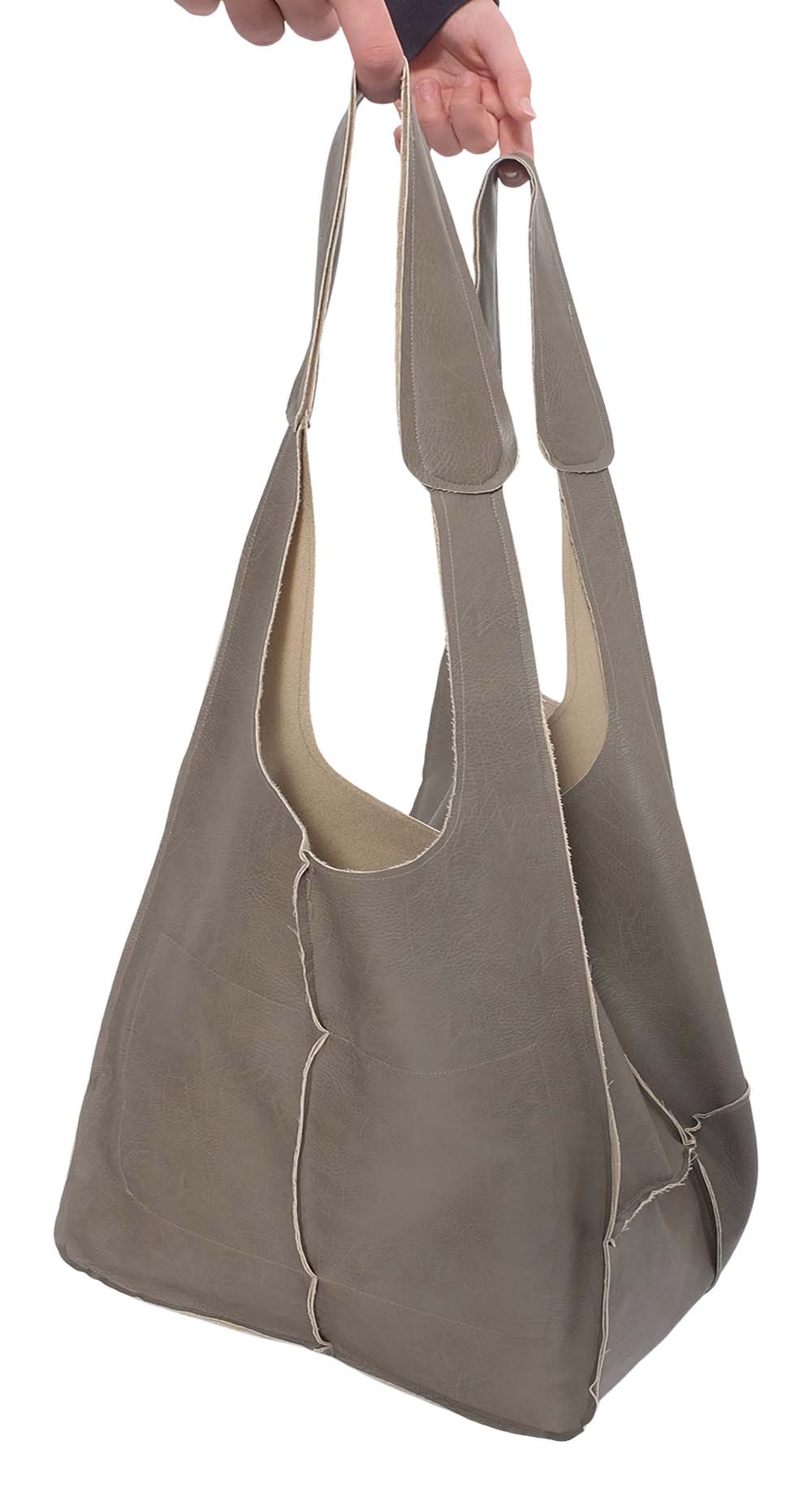 Diese hübsche Shopper Tasche ist ein toller Begleiter durch das ganze Jahr und ein wirkliches Raumwunder. Gelegt sieht sie gar nicht dananch aus, aber wenn sie aufgeklappt ist, dann geht da richtig was rein. Je nach Dicke und Qualität des Leders wird sie immer unterschiedlich fallen und aussehen.