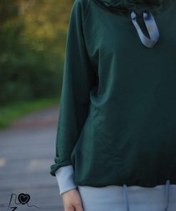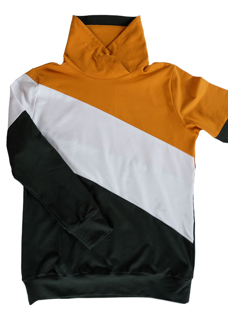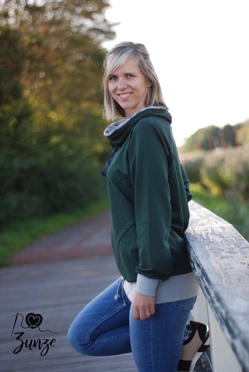 Ein hochwertiger French Terry Stoff aus Baumwolle/Elasthan in Grün. Sweatshirts, Kleider, Shirts, Hosen, Mützen und vieles mehr lassen sich hier wunderbar daraus nähen. Die Innenseite hat die typische Schlangenoptik. Sehr hübsch sieht hier die Farbe Weiß und Curry dazu aus. Abbildung Schnittmuster Jamika, Shirt Maren und Hoodie David.