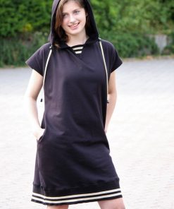 Ein einfaches, aber schönes Kleid mit einer kreativen Taschenlösung. Die Stoffkanten an der Kapuze und an der Tasche werden offen verarbeitet. Wir haben bei dem weißen Kleid eine negativ Applikation eingearbeitet, diese kannst Du kostenlos bei uns im Shop herunterladen. Den Einsatz am Vorderteil kannst Du einarbeiten oder auch weglassen, somit ist dieses Schnittmuster auch für Nähanfängerinnen geeignet. Durch die Auswahl des Stoffes und verschiedener Bänder oder Applikationen wird es immer wieder anders aussehen. Beim dem Kinderkleid haben wir eine Applikation aufgenäht.
