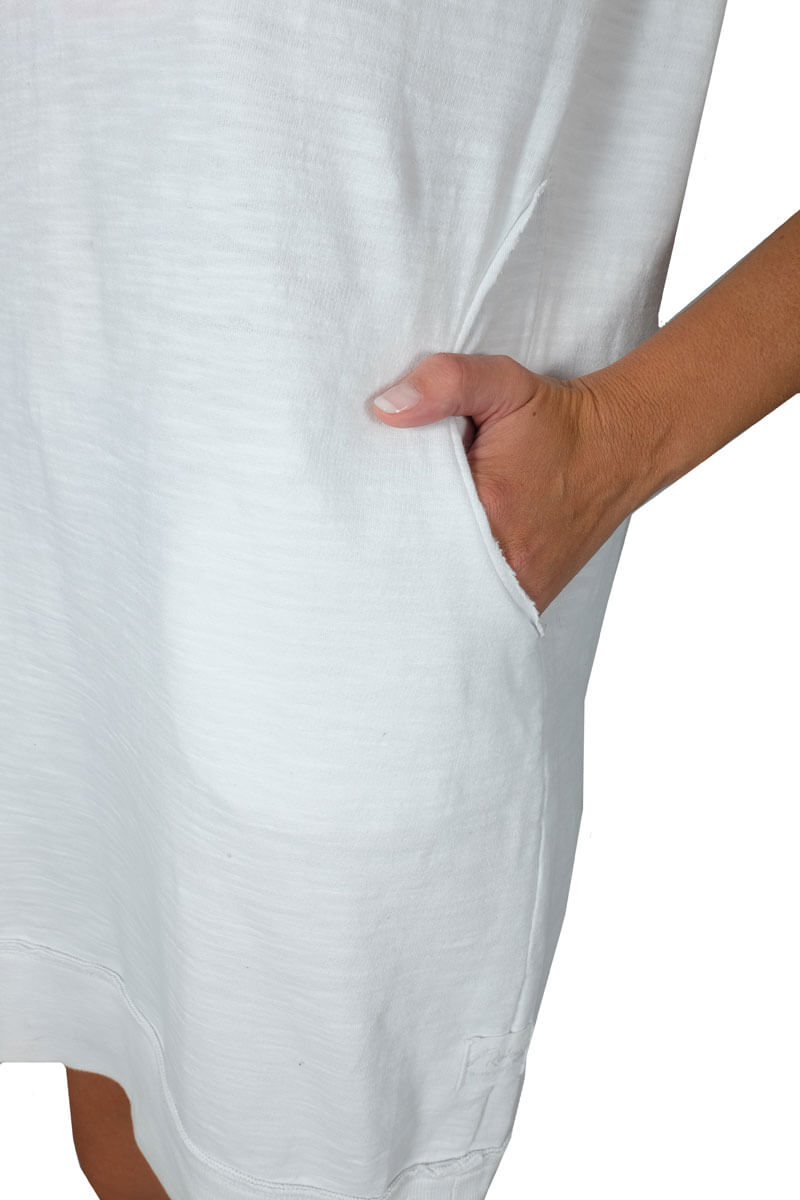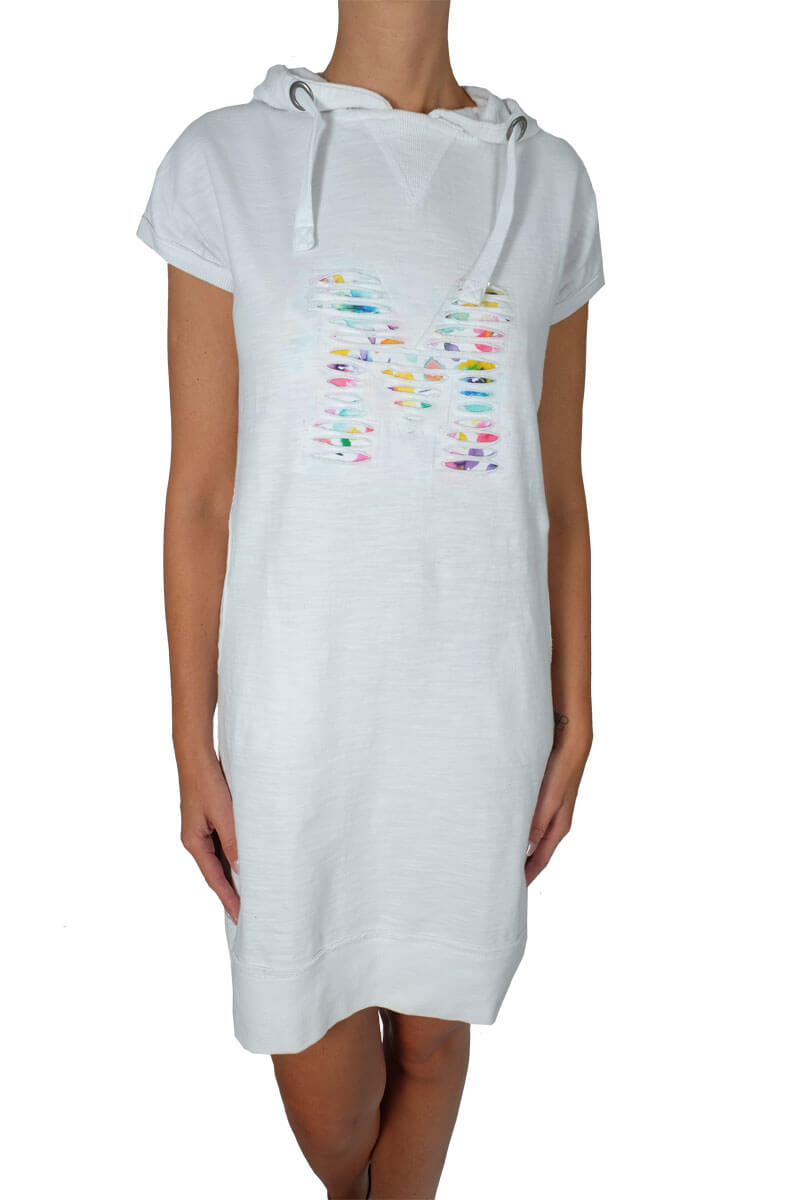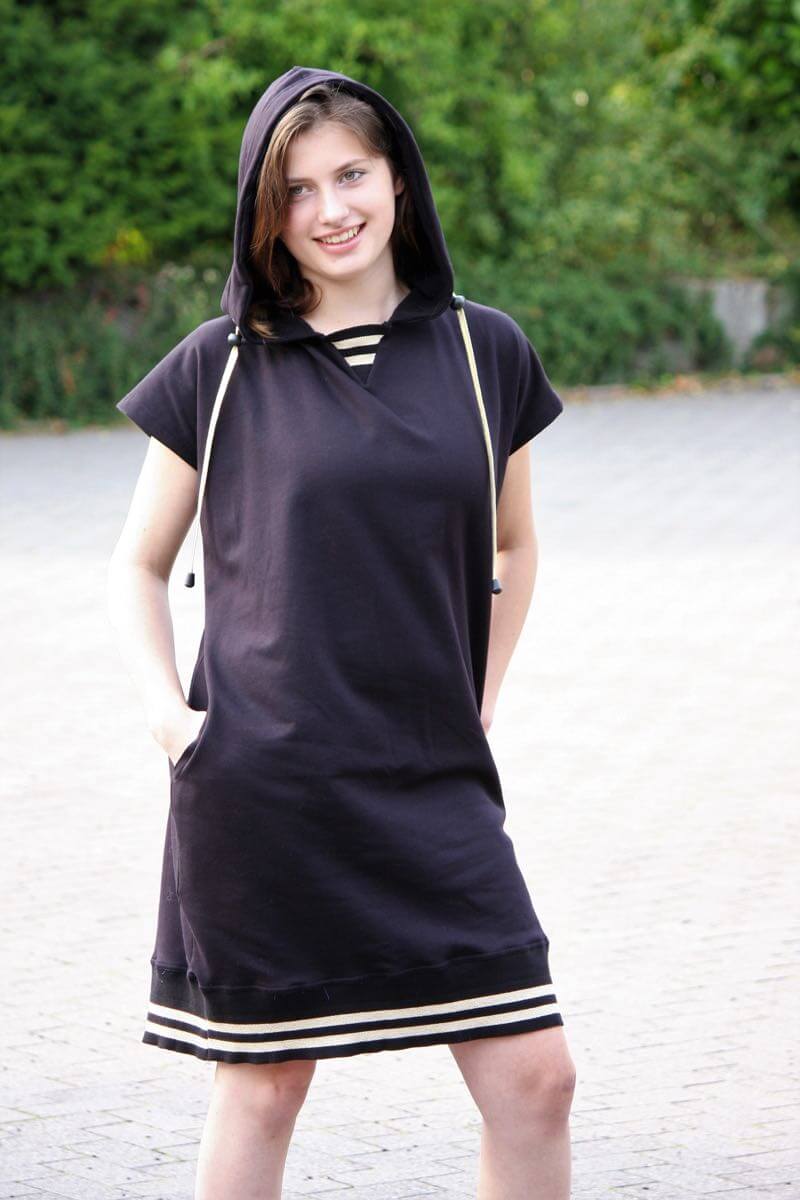 Ein einfaches, aber schönes Kleid mit einer kreativen Taschenlösung. Die Stoffkanten an der Kapuze und an der Tasche werden offen verarbeitet. Wir haben bei dem weißen Kleid eine negativ Applikation eingearbeitet, diese kannst Du kostenlos bei uns im Shop herunterladen. Den Einsatz am Vorderteil kannst Du einarbeiten oder auch weglassen, somit ist dieses Schnittmuster auch für Nähanfängerinnen geeignet. Durch die Auswahl des Stoffes und verschiedener Bänder oder Applikationen wird es immer wieder anders aussehen. Beim dem Kinderkleid haben wir eine Applikation aufgenäht.