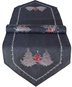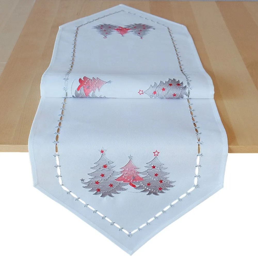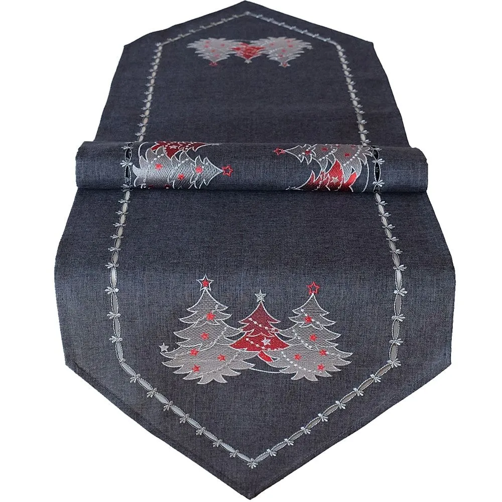 - Tischläufer / Mitteldecken spitz zulaufend in dunkelgrau & weiß mit gestickten Weihnachtsbäumen – optimal für Weihnachten