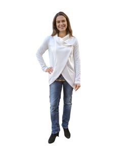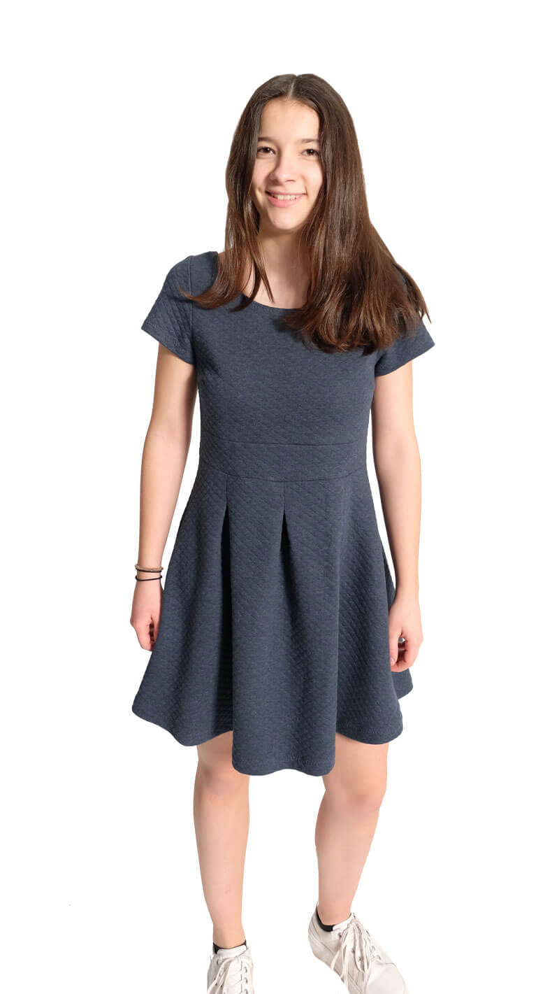 Ein aktuell angesagter, dehnbarer “Waffelstoff”. Er liegt wunderbar auf der Haut und ist kuschelig zu tragen. Du kannst ihn für Pullover, Kleider, Röcke und Sweatshirts verwenden. Jacke Heaven, Kleid Amanda und Pia in Blau /Ecru, die Hose aus unserem aktuellen Hosenbuch in Taupe, Shirt Tamme in Grau.