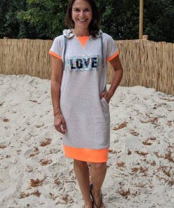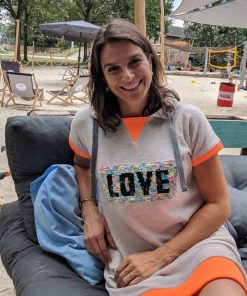Wendepailletten, Pailletten, Aufnähbilder sind aktuell ein großes Trendthema und sehr angesagt. Die Applikation muss aufgenäht werden. Abbildung Schnittmuster Hoodie Jean und der Titelpullover aus unserem Nähbuch “Hoodies” mit einer ähnlichen Applikation zur besseren Darstellung und das Kleid Fenna mit der Applikation in der Farbstellung.